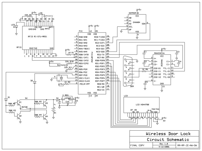 A lot has happened lately. The project is in a semi-functional state in which the UMS works with the circuit, and we are able to add/remove users and validate keys. The only thing not working in software is the menu system using the LCD menu. It basically works with some small problems. The source of most of our problems is figuring out how to put the circuit to sleep and then wake it back up again based on particular interrupts. However, we figured it out and now the PIC goes to sleep whenever it isn’t reading for a key (sleeps for 128ms, reads for 200ms). This is nice because we are able to go into ultimate-power-save-mode by sleeping everything and waking it up again.